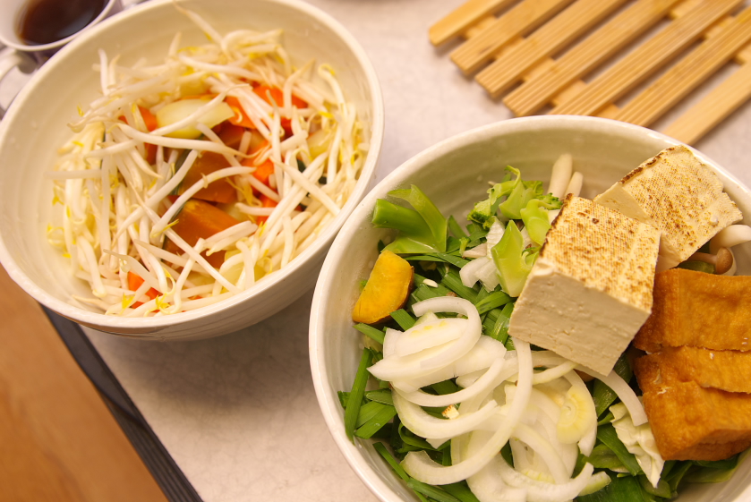 材料:鶏手羽元、ウインナー、玉葱、人参、じゃがいも、ニラ、もやし、かぼちゃ、ブロッコリー、さつまいも、白ネギ、厚揚げ、豆腐、にんにく、生姜、生唐辛子、サラダ油、バター、塩、胡椒、カレーのルウ、酒、醤油、みりん、昆布出汁、鰹出汁