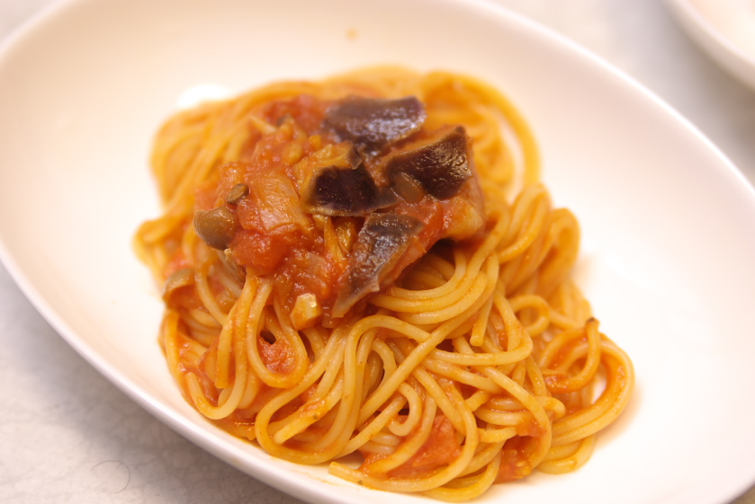 材料:トマト、なす、玉葱、にんにく、鷹の爪、オリーブオイル、マジックソルト、黒胡椒、白ワイン、ブイヨン、パスタ、トマトソース