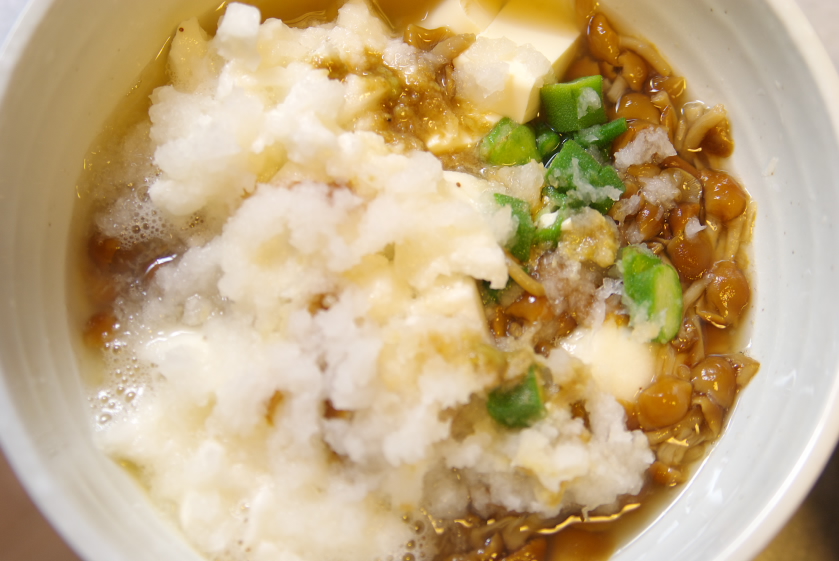 材料:おくら、山芋、なめこ、絹ごし豆腐、昆布出汁、醤油、山葵