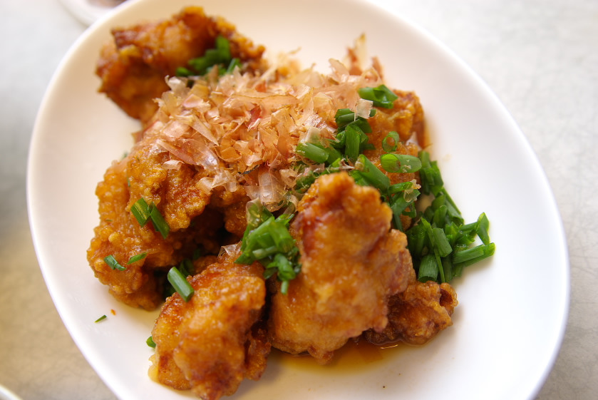 お惣菜のからあげに刻みネギと鰹節を振ってポンズとごま油を加えレンジで加熱したガゴ。