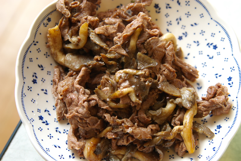 牛肉とひらたけのすき焼き風炒め物ガゴ。