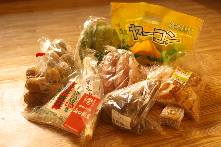 ヤーコン(蓮根と梨の中間のようなシャキシャキとした食感のお芋で健康にいいらしいガゴ)、種子島の薩摩芋、キウイ、納豆2種、宮城の御菓子2種