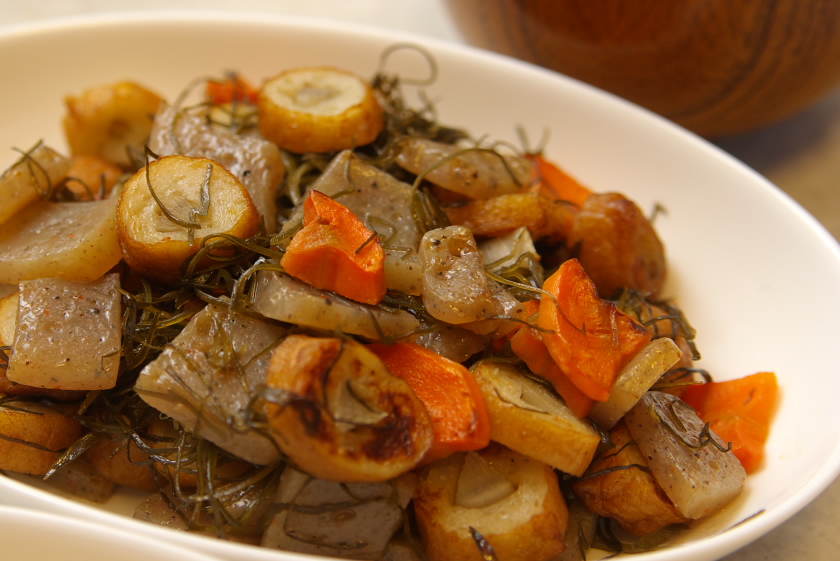 材料:ごぼうてん、人参、こんにゃく、刻み昆布、ごま油、酒、醤油、みりん、砂糖
