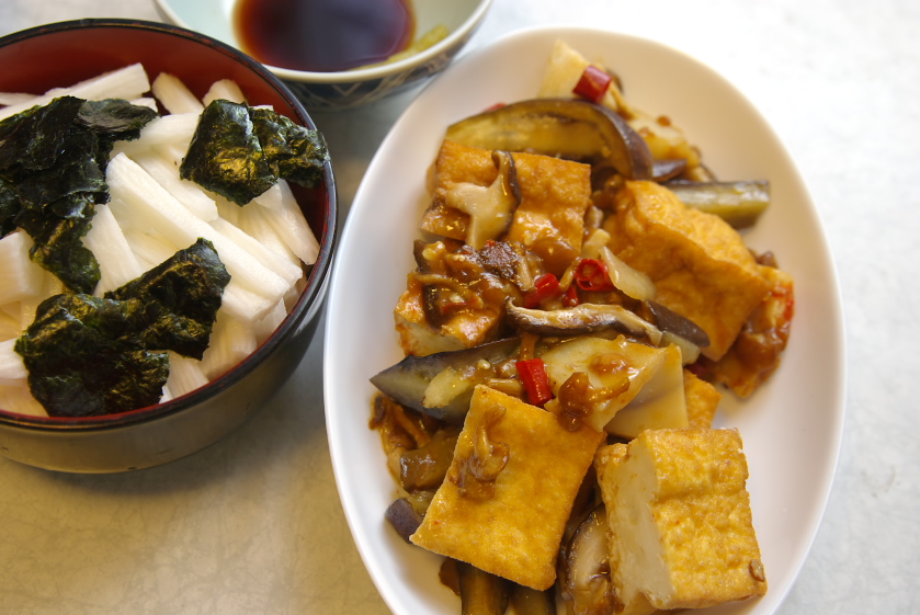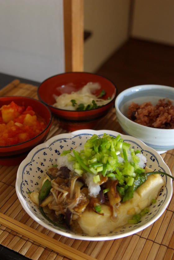 材料:木綿豆腐、なす、えのき、しいたけ、ししとう、にんにく、生姜、香味ネギ、大根、ごま油、醤油、めんつゆ、酒、片栗粉、水