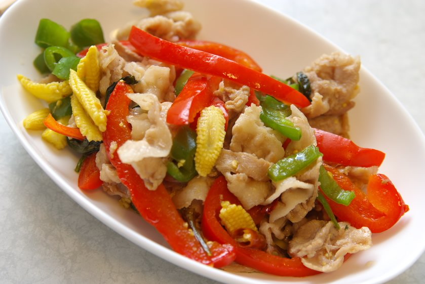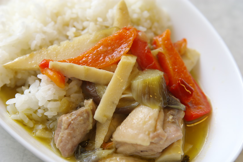1.鶏肉とパプリカは一口サイズに、なす、筍は薄切りにする。
