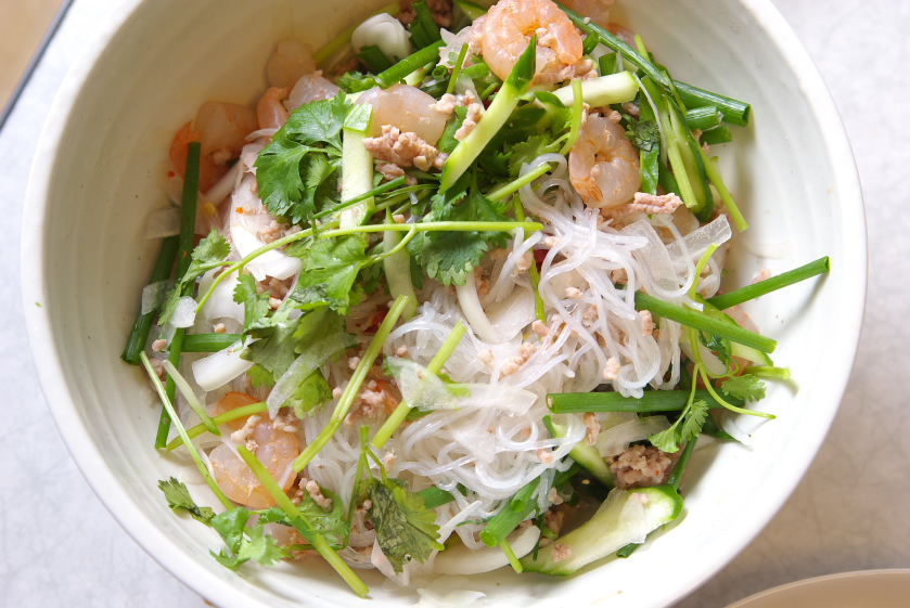 材料:春雨、えび、豚ミンチ、きゅうり、万能ネギ、玉葱、赤唐辛子、香草