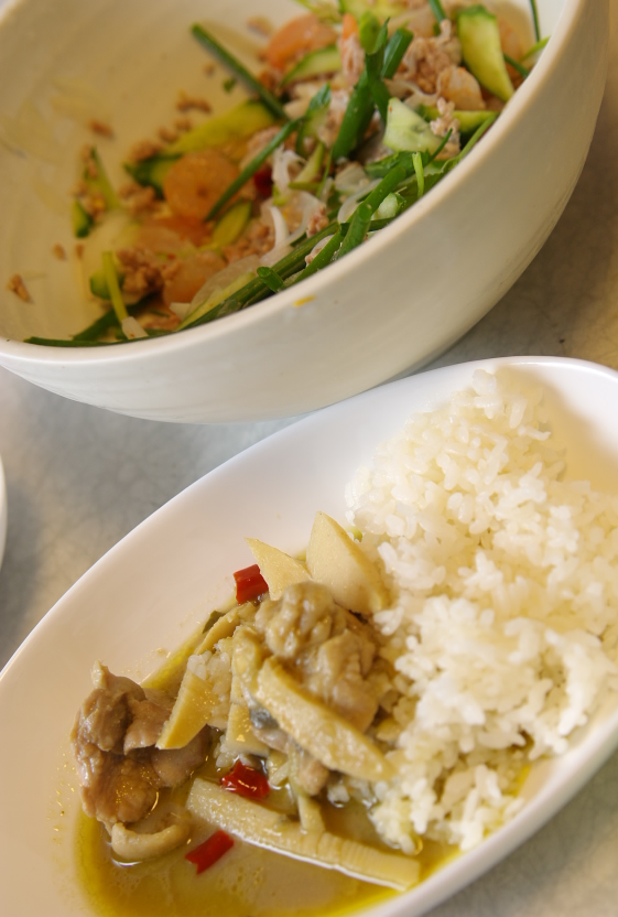 材料:鶏もも肉(300g)、グリーンカレーペースト(70g)、なす(1本)、水煮筍(1袋)、赤パプリカ(半分)、ココナッツクリーム(1缶=400g)、赤唐辛子(1本)、ナンプラー(大2)、粉末鶏がらスープの素少々、砂糖一つまみ、バジル少々