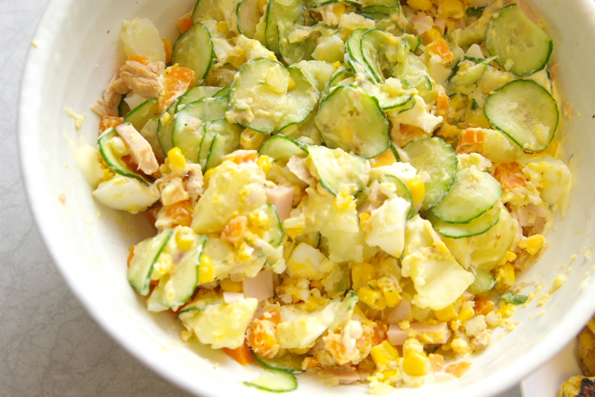 材料:じゃがいも、人参、コーン(缶詰)、きゅうり、シーチキン、ハム、粉末バジル、マヨネーズ、マジックソルト、黒胡椒