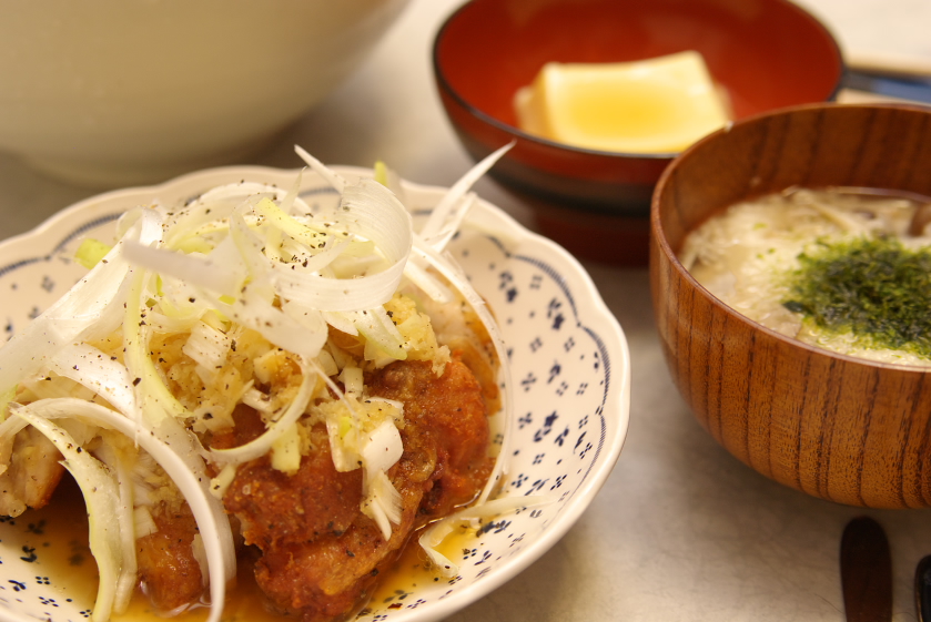 材料:鶏もも肉、白ネギ、にんにく、生姜、油、片栗粉、塩、胡椒、酒、小麦粉