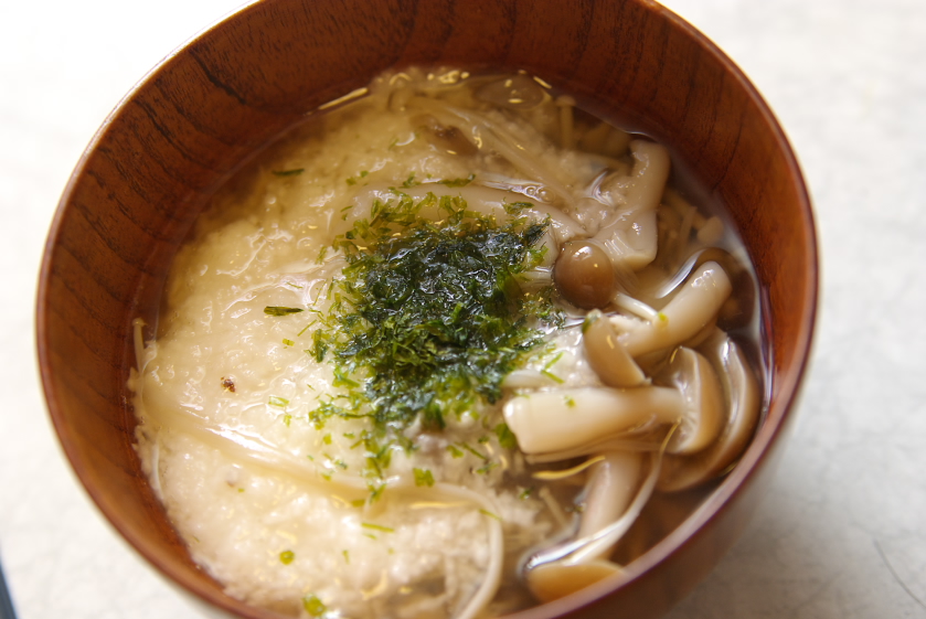 材料:しいたけ、えのき、ぶなしめじ、しめじ、長芋、めんつゆ、出汁醤油、白出汁、片栗粉、青海苔