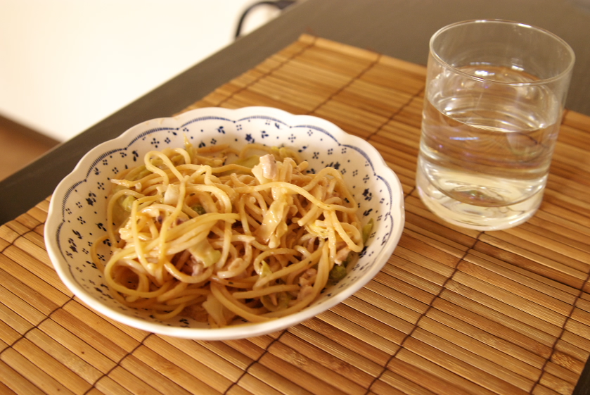 材料(2~3人分):パスタ200g、イカ塩辛(大3)、キャベツ(1/4玉)、オリーブオイル、、白ワイン、顆粒コンソメ(小1弱)