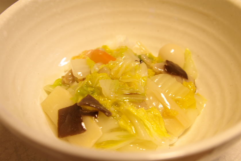 4.蓋をしてキャベツがしんなりしたら、イカ塩辛入れ白ワインを加えて炒める。