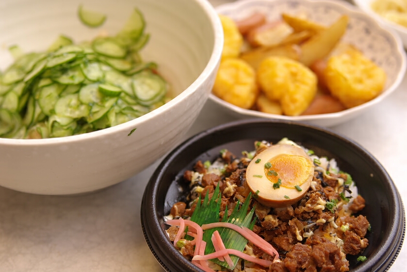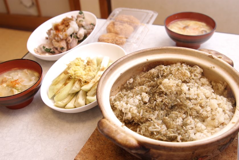 【右下:じゃこと昆布の炊き込みご飯/中央手前:蒸しなすの生姜和え/中央奥:おからコロッケ/左上:大葉の豚肉巻き/左:豚汁】