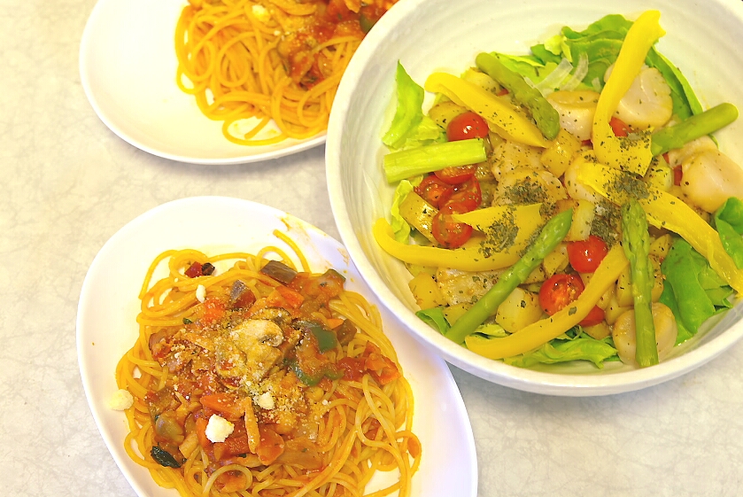 材料:ホタテ、玉葱、パプリカ、アスパラ、じゃがいも、サラダ菜、プチトマト、オリーブオイル、マジックソルト、胡椒、醤油、レモン汁、バジル