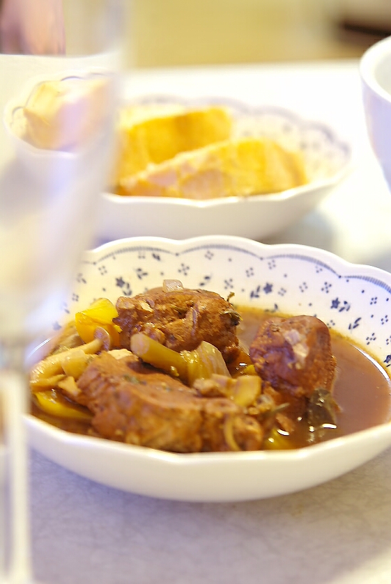 材料:豚ヒレ肉塊、玉葱、マッシュルーム、パプリカ、アスパラ、ぶなしめじ、茄子、にんにく、ローズマリー、セージ、ローリエ、バルサミコ酢、白ワイン、砂糖、オリーブオイル、コンソメ、ブイヨン