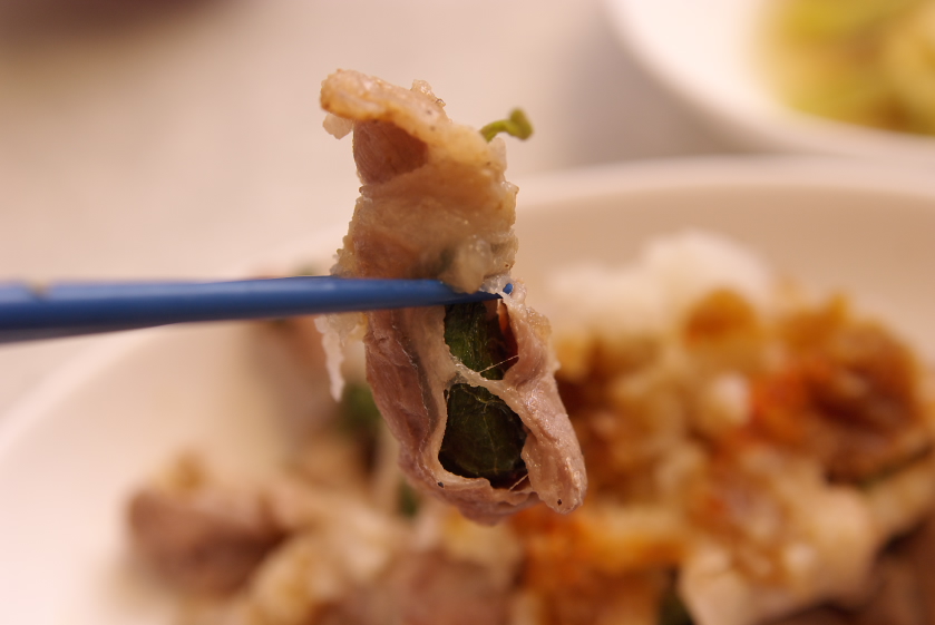 材料:豚肉(薄切り)、大葉、大根、醤油、めんつゆ、七味、油、酒、塩、胡椒