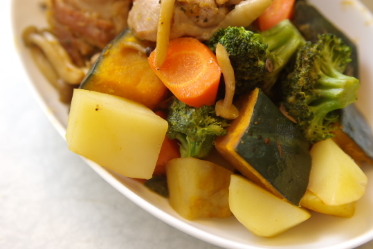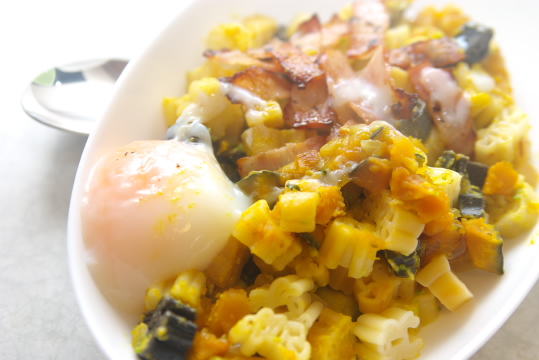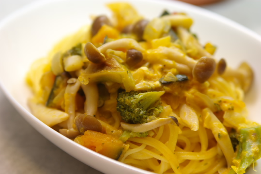 材料:豚ミンチ、玉葱、ブロッコリー、ぶなしめじ、かぼちゃ、オリーブオイル、マジックソルト、固形ブイヨン、クリームチーズ、パスタのためのオイルソース、パスタ、塩