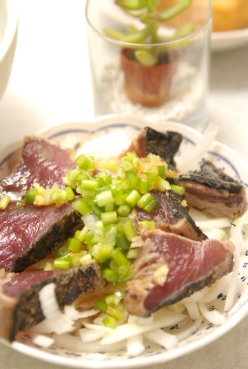 材料:かつおのタタキ、たまねぎ、生姜、みやむらさんのばんのうたれ