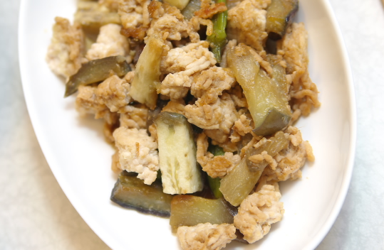材料:鶏むねミンチ、なす、出汁醤油、みりん、酒、砂糖、ごま油
