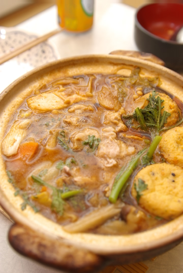 材料:豚肉、白菜、菊菜、大根、人参、ごぼう、椎茸、えのき、里芋、昆布、味噌鍋の素(牡丹鍋についてた味噌)